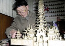 雕塑的4座大殿外面,各有唐僧師徒4人的精巧造型,栩栩如生。高約2厘米的孫悟空活潑俏皮,面部表情豐富,眼皮上鑲嵌了一塊肉眼幾乎看不見(jiàn)的銅片,寓意火眼金睛。豬八戒扛著釘耙,神色憨厚。最絕的是沙僧和唐僧頸項(xiàng)中的佛珠,各有30粒圓珠,每粒不足油菜子大小,用細(xì)銅絲穿起,造型逼真。