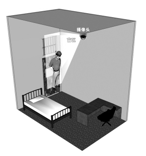 室內(nèi)東南角離地面3.1米處安裝有一斜下視的監(jiān)控探頭,由于這個(gè)探頭安裝位置較高,受監(jiān)控頭視界的技術(shù)指標(biāo)限制,在候問室北側(cè)墻體和通風(fēng)門窗處形成了約14厘米高、面積約為0.16平方米的監(jiān)控盲區(qū)。邢鯤正是在這一監(jiān)控盲區(qū)上自縊的。