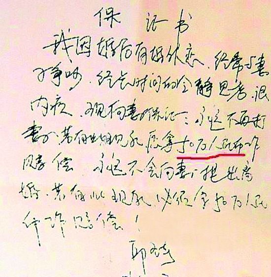 帖文稱,邱在結(jié)婚后有多次婚外情,在被發(fā)現(xiàn)后,曾經(jīng)保證不再與其他女性有不正當(dāng)關(guān)系,并先后兩次寫下保證書。保證書寫道,“我因婚后有婚外戀,經(jīng)常與妻子爭吵,經(jīng)長時間的冷靜思考,很內(nèi)疚,特向妻子保證,永遠(yuǎn)不再打妻子,永遠(yuǎn)不會向妻子提出離婚,若有此現(xiàn)象,愿拿50萬元作為賠償。”