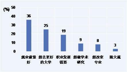 2. 調(diào)查發(fā)現(xiàn),在被調(diào)查的計(jì)劃國內(nèi)讀研的2011屆本科畢業(yè)生中,排名第一的讀研理由是為了“就業(yè)前景好”(36%);其次為“想去更好的大學(xué)”(25%);“職業(yè)發(fā)展需要”這一理由排名第三(19%)。超過半數(shù)的被調(diào)查者選擇繼續(xù)在國內(nèi)讀研的理由與就業(yè)期待相關(guān)。就業(yè)期待成為讀研的主要原動(dòng)力。