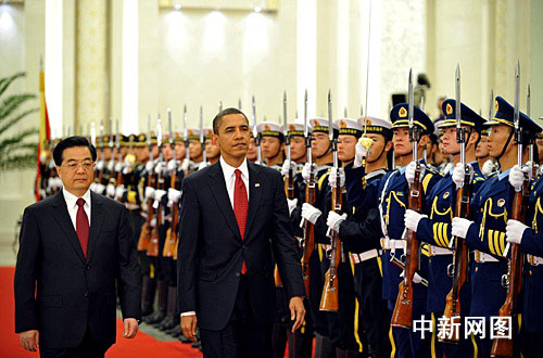 中國(guó)國(guó)家主席胡錦濤17日上午約9點(diǎn)50分在人民大會(huì)堂北大廳舉行儀式,歡迎美國(guó)第44任總統(tǒng)奧巴馬對(duì)中國(guó)進(jìn)行國(guó)事訪問。